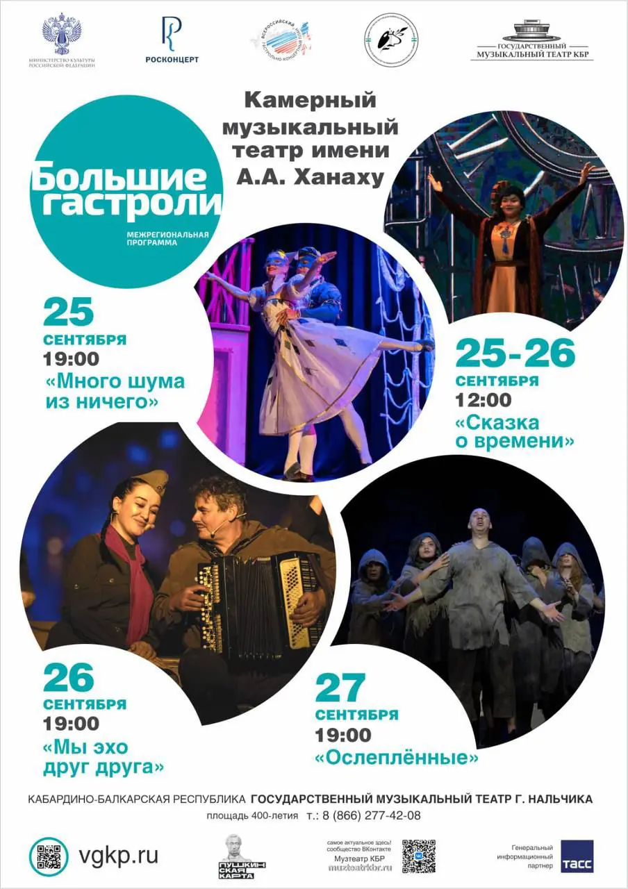 С 25 по 27 сентября состоятся обменные гастроли по программе «Большие гастроли» между Государственным музыкальным театром КБР и Камерным музыкальным театром Республики Адыгея им. А.А. Ханаху.